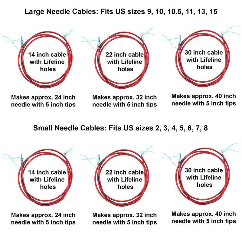 - Set includes 6 cable lengths 3 for Small needles and 3 for Large needles: 14" (35cm), 22" (55cm), and 30" (75cm); 2 cable connectors (1 of each of Small & Large), 4 End Stoppers (2 each of Small & Large) and two tightening keys