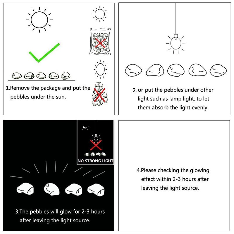- After absorbing light, the pebble will glow brighter within 2-3 hours, and then the brightness will decay quickly.
