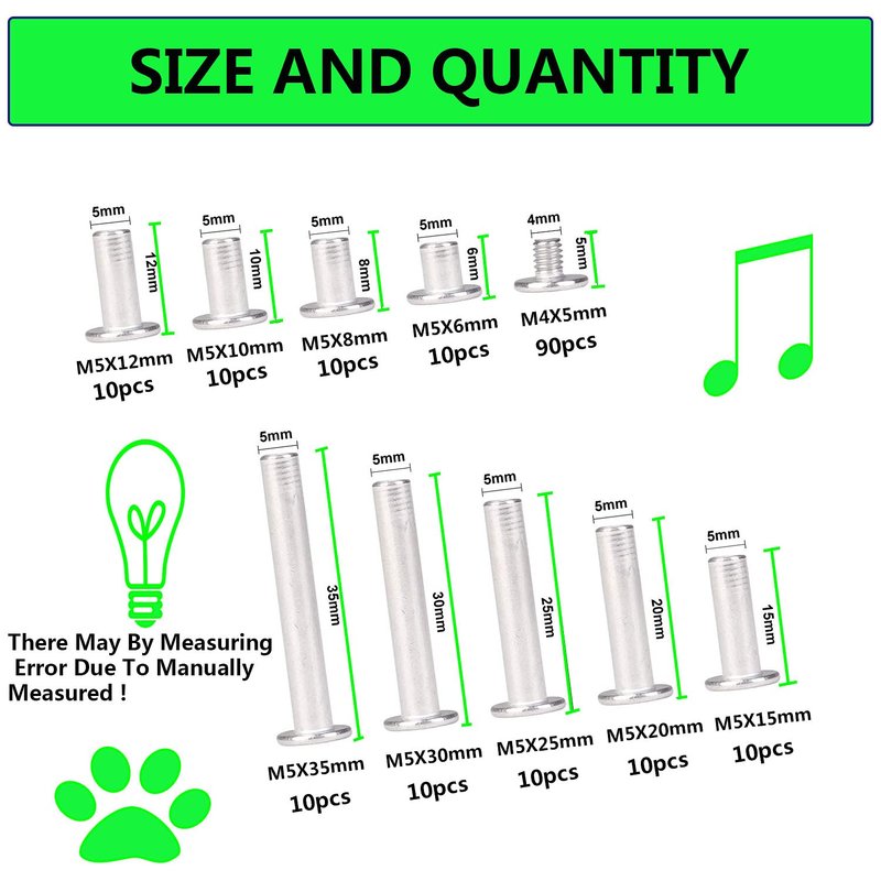 - ➤Chicago Binding Screws Size Include: In this set, it include 9 size of binding screws total 180pcs(90pair) are sorted packed in a plastic box to avoid mess. Which diameter is 5mm(3/16inch), length are M5x6/8/10/12/15/20/25/30/35mm. Thread length are 5mm.