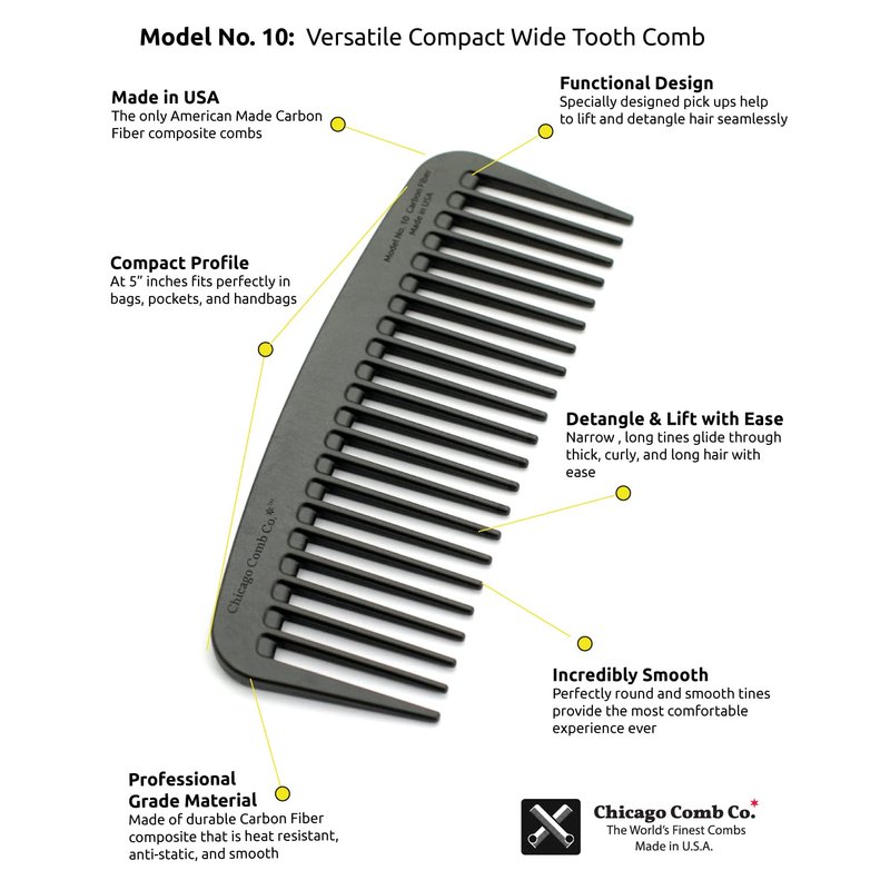 Chicago Comb Model 10 Carbon Fiber is a uniquely versatile compact wide tooth comb, perfect for both men and women. Its long, smooth teeth are ideal for detangling and combing long, curly, and natural hair, as well as large beards. Model 10 is a great daily use bathroom and shower comb, and also fits perfectly in bags, pockets, and handbags. Made of a carbon fiber composite that’s smooth, strong, and light. It’s also anti-static, resists heat and chemicals, and can be left in the shower without warping. Made in USA.
