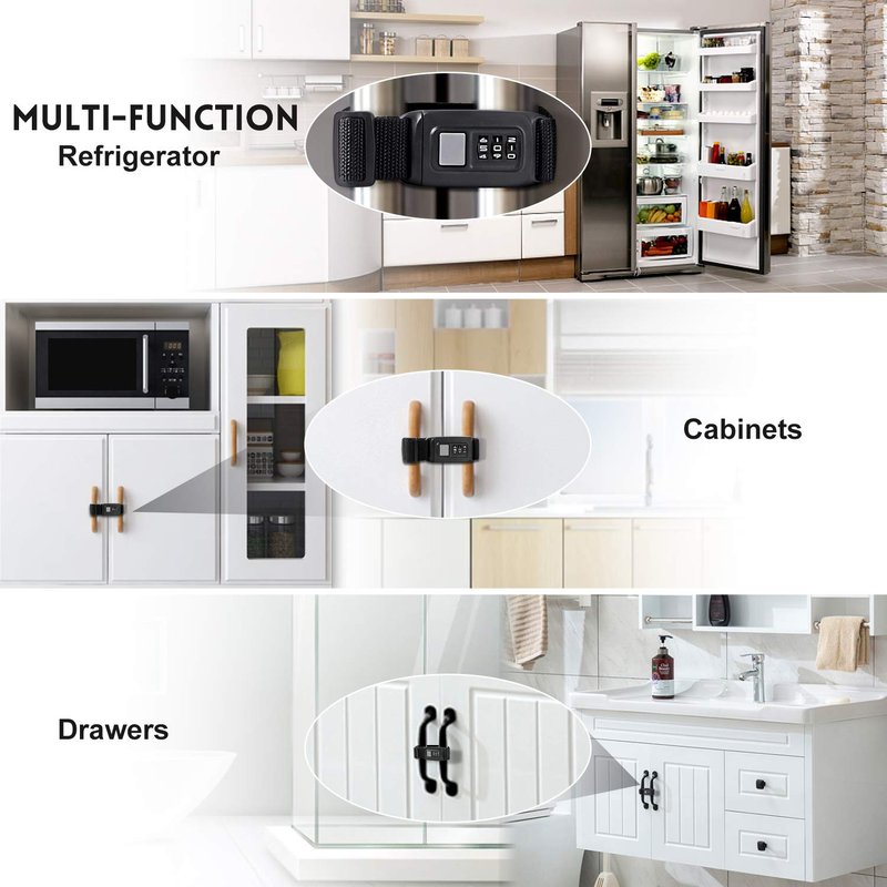 - 🚪 Multi-Functional: Use as fridge lock, or for cabinets, drawers, cupboards, trash cans, ovens, etc. Two-step unlock protection to prevent naughty children from opening easily.