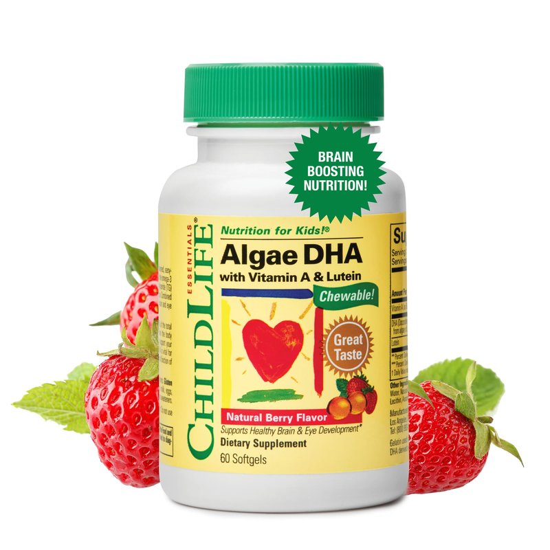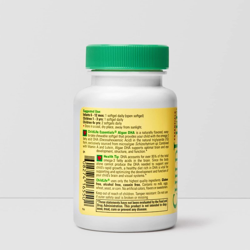 ChildLife Essentials Algae DHA is a naturally flavored, easy-to-take chewable softgel that provides your child with omega-3 fatty acid DHA (Docosahexaenoic Acid) in the natural triglyceride (TG) form, exclusively sourced from the microalgae Schizochytrium. Combined with Vitamin A and Lutein, Algae DHA supports optimal brain and eye development, structure, and function.