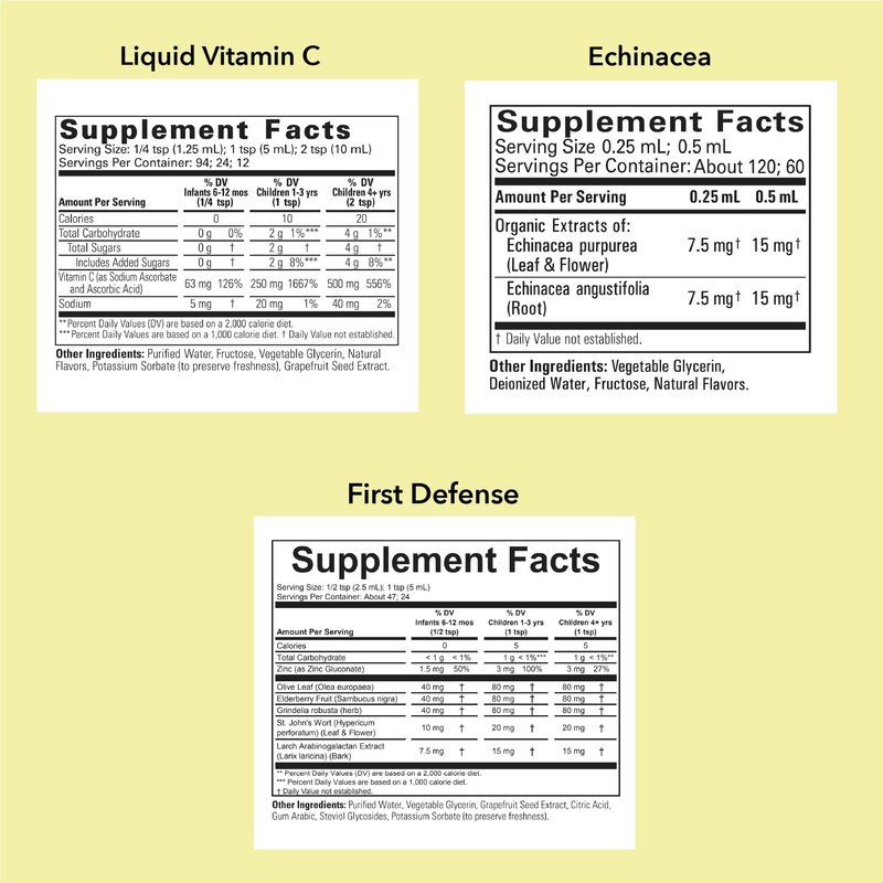 - IMMUNE SUPPORT BUNDLE - Contains our First Defense, Liquid Vitamin C, and Liquid Echinacea. These all-natural vitamins for kids are designed to boost your child’s immune system during colder seasons to keep them feeling healthy