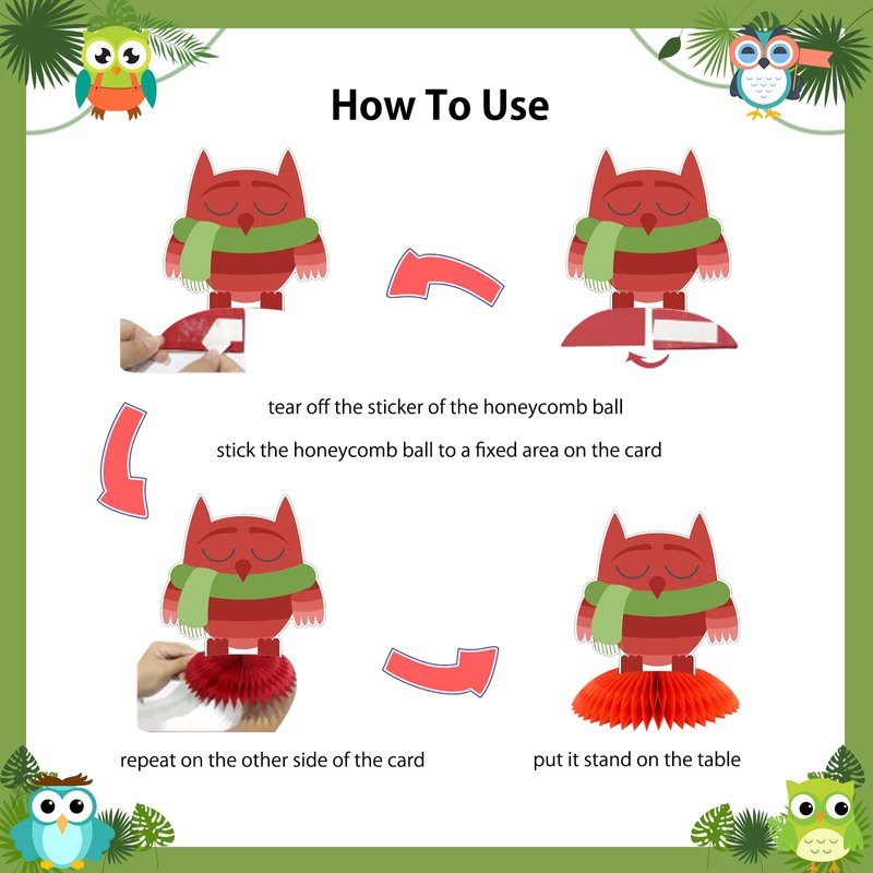 - [Easy to install] - Remove the sticker on the honeycomb ball, then stick the honeycomb ball to a fixed area on the owl cards. Repeat the above steps on the other side of the card. Finally, put it stand on the table. Just so easy to set up, saving a lot of time.