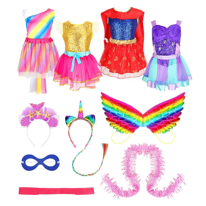 - 👸【Complete Dress up Play Set for Role Play】: Dress up clothes for girls 4-6 feature four different role,they can dress up as noble rainbow unicorn dress,beautiful kind little purple mermaid dress, playful pink fairy costume,agile super girls princess,your little girl will love these brave and cute dress combination,costume sets for girls in very nice gift box, great as a gift for little girls.