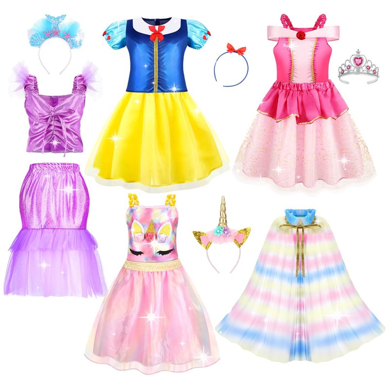 - 4 Themed Fantasy Princess Dress-up Sets:Each princess dress up for girls has a unique pattern and design,hoping girls as innocent as unicorn, as witty as mermaid, as brave as classic fairy princess, as kind as red princess, allowing the little princess to switch to a variety of styles at will. Imagine your little girls wear princess dresses and crowns on their heads for themed parties or cosplay events, will be the most dazzling princess!