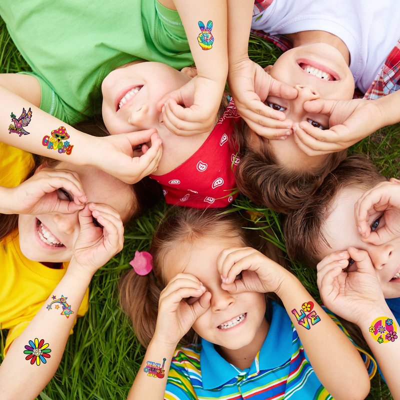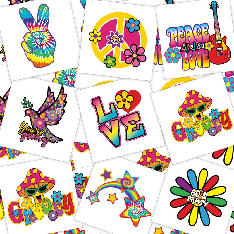 Chinco 144 Pcs Hippie Temporary Tattoo Stickers for Kids 70s 80s 90s Groovy Hippie Tattoos Waterproof Hippie Face Tattoos Love and Peace Sign Temporary Tattoos Decals for Tie Dye Hippie Party Favors