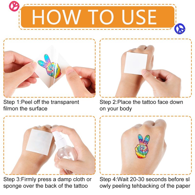 - How to use: choose your favorite pattern of the temporary tattoos, then peel off the film on the surface, stick the side with the pattern to the skin, soak the surface of the hippie body tattoo with water, wait for about 5 minutes before you take it off, and then the pattern will appear on your skin