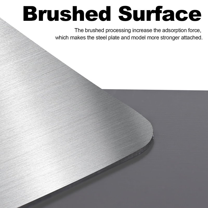 - Flexible and Durable Material: The magnetic building plate is made of stainless steel material with chromium content. The steel plate not only has great flexibility and durability to prevent deform, but also has good corrosion resistance to prevent rust. After bending and removing the model, it can be restored original shape and reused. The surface of the steel build plate adopts brushed craft and the stronger adsorption can prevent the model falling off during printing.