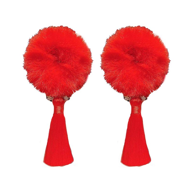 The hair clip features a poofy ball at the top with long tassels, bringing a traditional Chinese touch to the design. The vibrant red color symbolizes luck and joy, making these hair clips suitable for various occasions.
