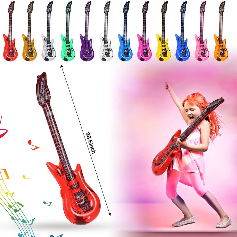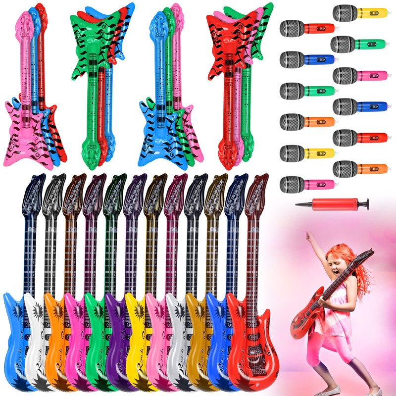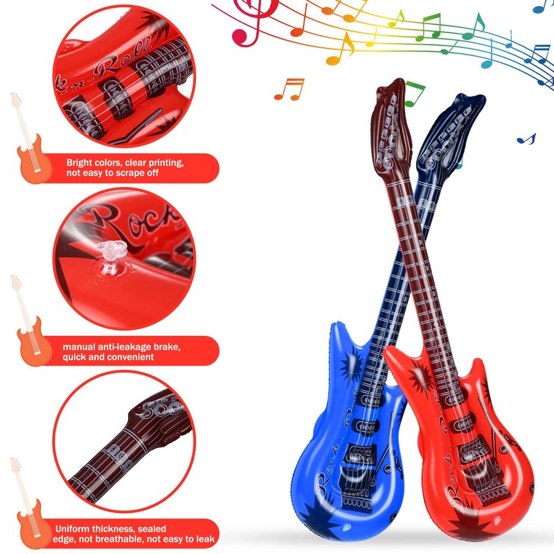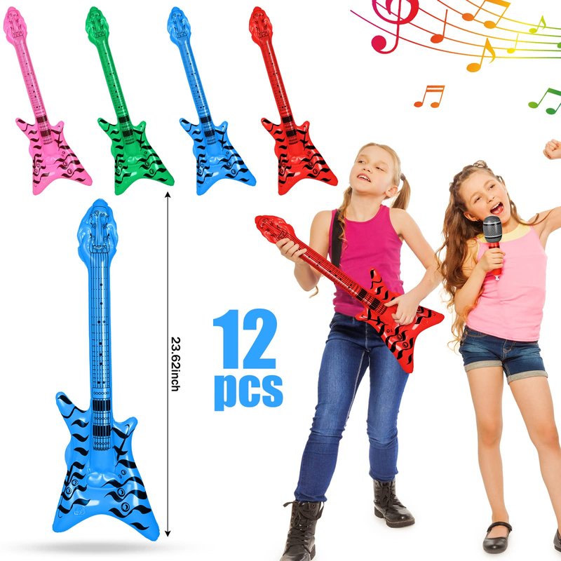 Features: These fake instruments will be interesting decorations in various kinds of occasions, nicely enhancing the party atmosphere and making your guests impressed. Blow up microphone and inflatable guitars for parties bulk allow you to send as gifts to students, little guys, relatives, classmates and more. Specifications: Guitar: Material: PVCColor: purple, pink, gold, yellow, green, white, gray, blue, dark blue, red, rose red, orangeSize: about 36.61 inches in lengthBass guitar: Material: PVCColor: red, blue, green, pinkSize: about 23.62 inches in lengthMicrophones: Material: PVCColor: blue, yellow, pink, green, red, orangeSize: about 9.84 inches in lengthPackage includes: 12 x Blow up guitars12 x Inflatable microphones12 x Inflatable bass guitars1 x Hand held air inflatorNotes: Manual measurement, please allow slight errors on size. The color may exist a slight difference due to different screen displays. Please do not overfill them, and keep them away from anything pointed and heated.