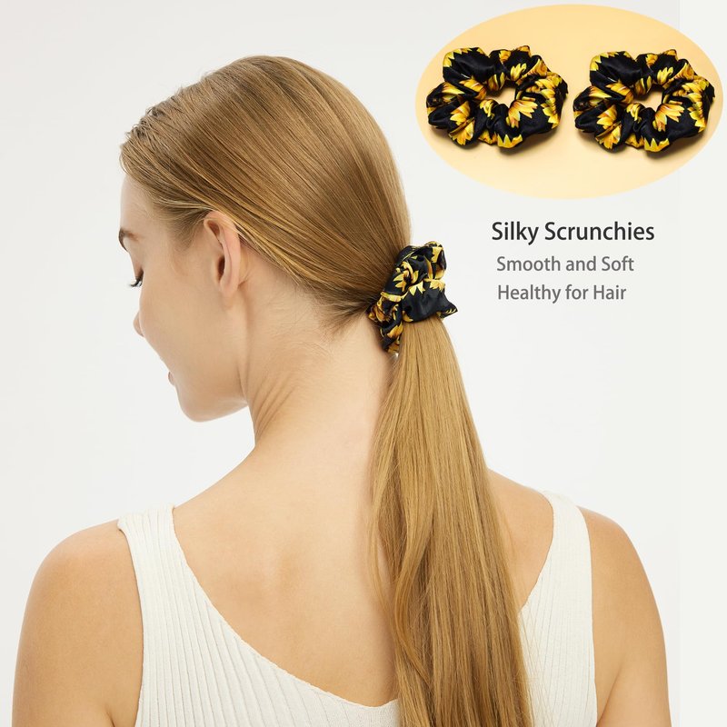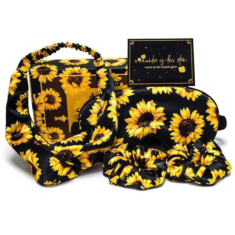 Sunflowers Print Gifts Set for Women, Sending Sunshine Gifts Box with Silk Headband, Hair Scrunchies and Sleep Eye Mask for Birthday, Christmas, Valentine's Day, Mothers Day Gifts Ideas Sunflower Gifts Set: This sunflower-themed gifts set embodies fashion, sunshine, positivity, and warmth, they’re eye-catching and a great surprise to those who loves sunflowers! with a vibrant sunflower print scheme and carefully selected items to brighten up her life! 5 Pcs Accessories in the Box: a headband, two hair scrunchies, an sleep eye mask and a greeting card. Silky and Comfortable Material: The headband and scrunchies are made of silk, the surface is smooth, soft and breathable, they will protect the hair and bring with comfortable using experience. The mulberry silk eye mask also provides a luxurious touch on the skin, offering unparalleled softness and breathability for the most exquisite sleep. They're all stretchy to be conveniently used. Suitable for Various Occasions:These boutique headband and scrunchies are great to wear in daily fashion outfits, facial cleansing and care and sports, such as Pilates, go yoga / running / hiking, party, prom, etc. The eye mask is 100% blocking the light, ensuring a deep sleep. Unique Gift Ideas: the sunflower gifts set includes a small greeting card, you can write your sincere greetings to show your blessing and care to best friend, sister, girlfriend, wife, mom, coworker, teacher, nurse on birthday, Christmas, Thanksgiving, Mother's Day, Valentine's Day, etc.