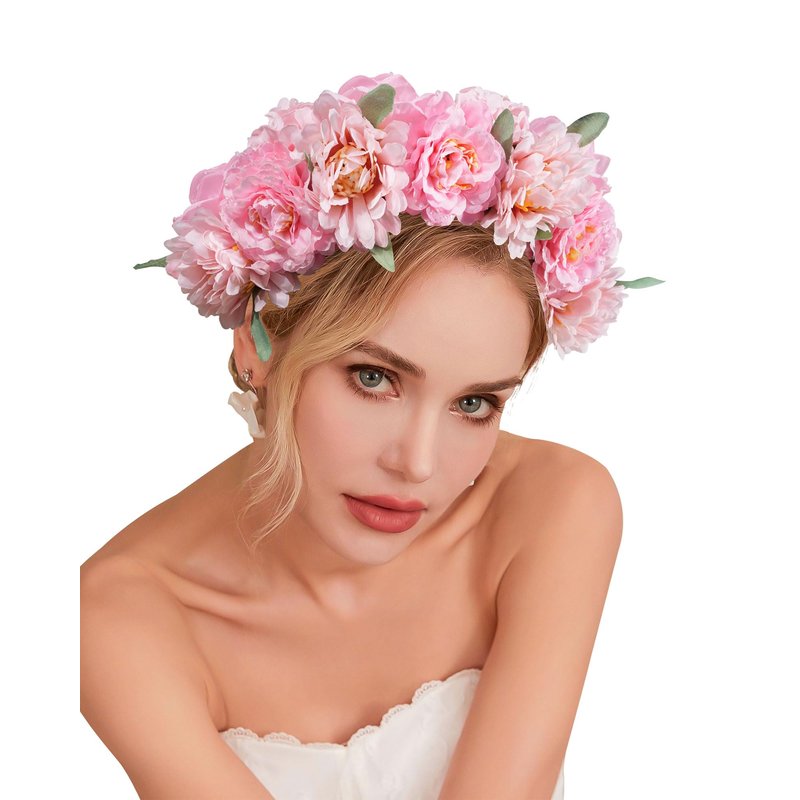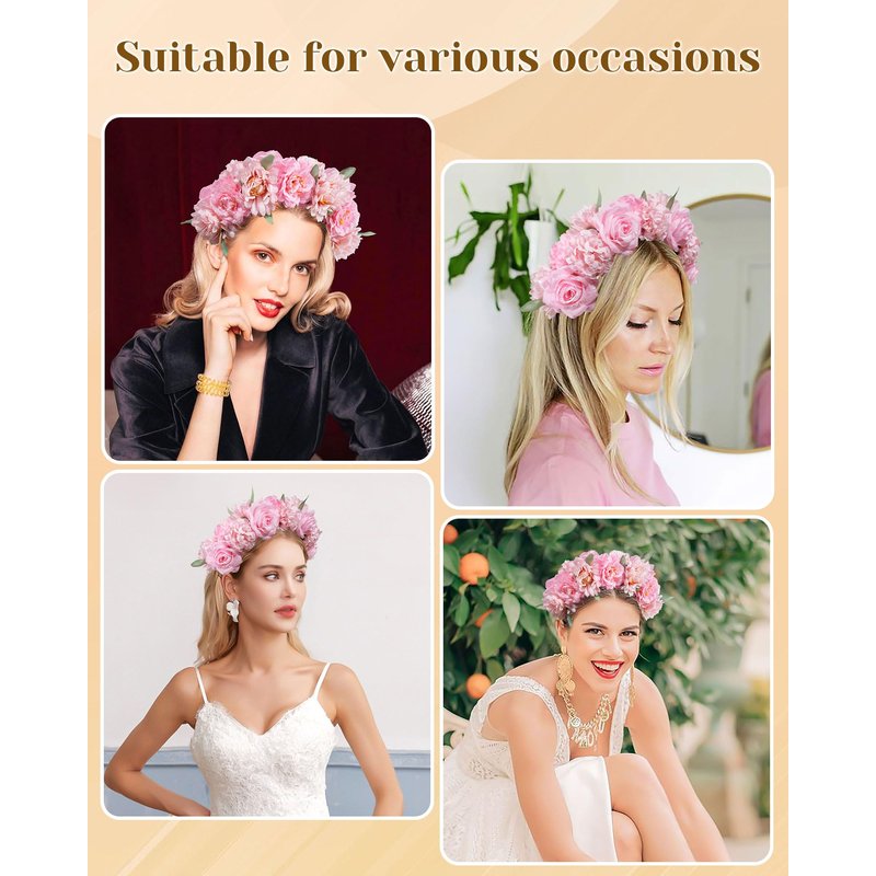 Material - The women flower crown is handmade from artificial flowers, artificial green leaves. It is very soft and comfortable and does not catch hair. It can solve the troubles of people who are allergic to flower petals.