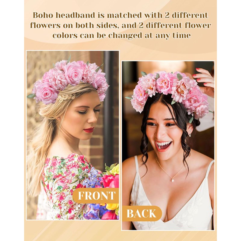 - 🌹【Double-Sided Flower Headband】Boho headband is matched with 2 different flowers on both sides, and 2 different flower colors can be changed at any time. The flowers are large, plump and brightly colored, suitable for people allergic to flowers or suffer from headaches due to their fragrance.