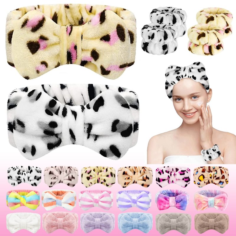 CHNLML Women Spa Headband Sponge,6PCS Bow Face Wash Headband and Wristband Set, Makeup Headband, Spa Headband,Makeup Headband, Skincare Headbands (6PCS-Pink+White(leopard))