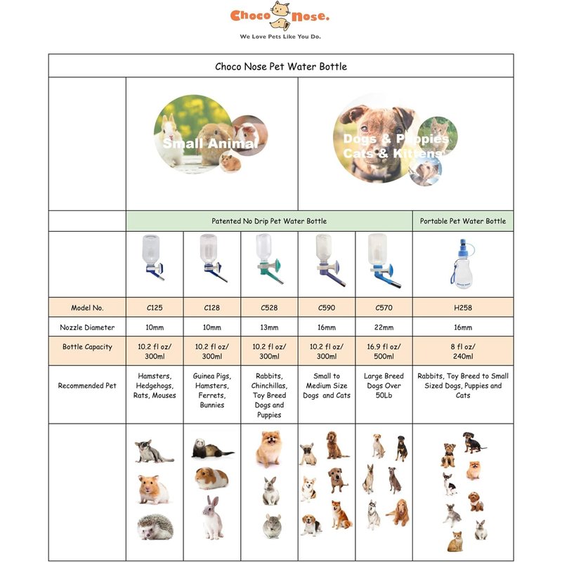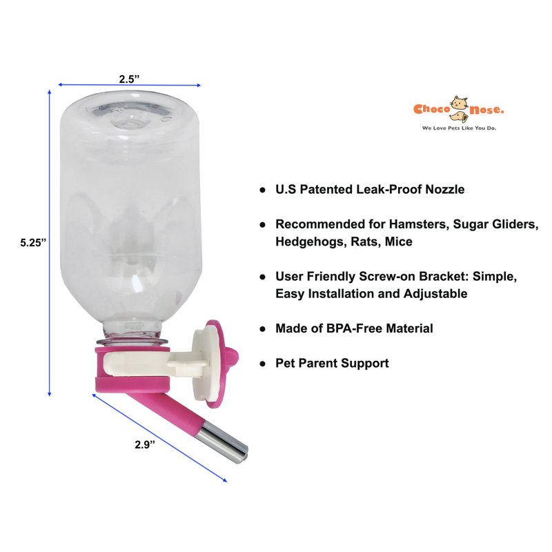 - 🐾 Why Choco Nose Water Bottle? Are You Tired of Changing the Wet Bedding for Your Pet Cage? This Is The Best Small Pet Water Bottle For Your Beloved Pets. Providing A Wet-Free and Mess-Free Living Area For Your Furry Kids Is Very Essential. Choco Nose U.S. Patented Leak Proof Nozzle Can Prevent Water Leakage Effectively. Our Innovative Design Allows Your Pets to Enjoy Clean and Fresh Water While Keeping Your Home Clean and Dry.