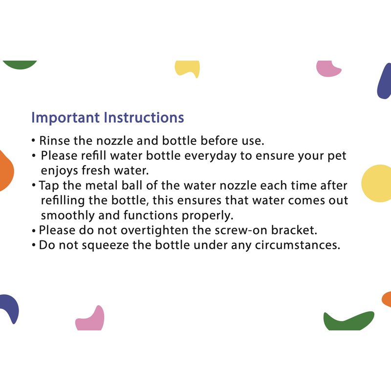 - 🐾 Very Important Instruction: Please Check the Water Bottle Daily and After Every Refill by Tapping the Metal Ball at the Nozzle Tip to Ensure Water Comes Out Properly. The Water Bottle is Ready to Use when Air Bubbles occur when you Tap the Metal Ball.