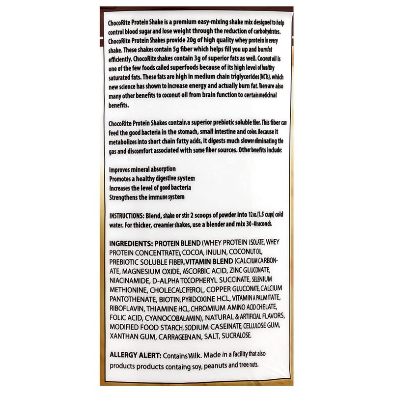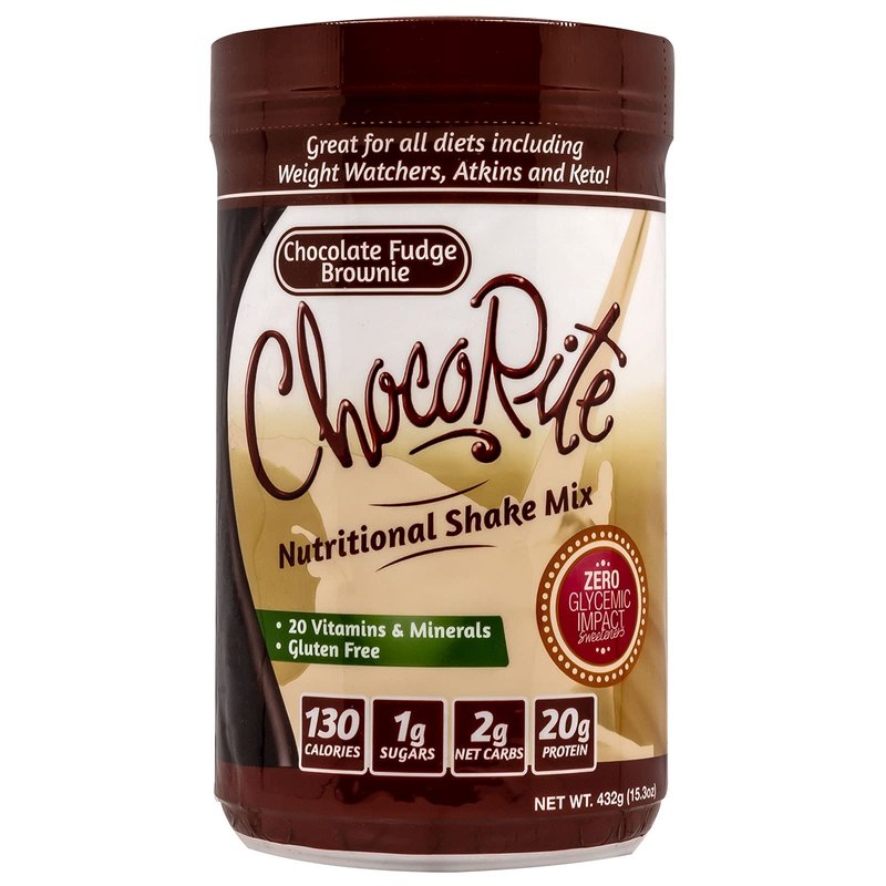 The ChocoRite Chocolate Fudge Brownie Protein Shake boasts the delicious taste and smell of oven fresh brownies fused into a high protein shake. This great tasting 130 calorie protein shake mix provides 5g fiber and 20 grams of protein. Great for low calorie & low carb diets. A delicious meal replacement for breakfast, lunch or dinner.