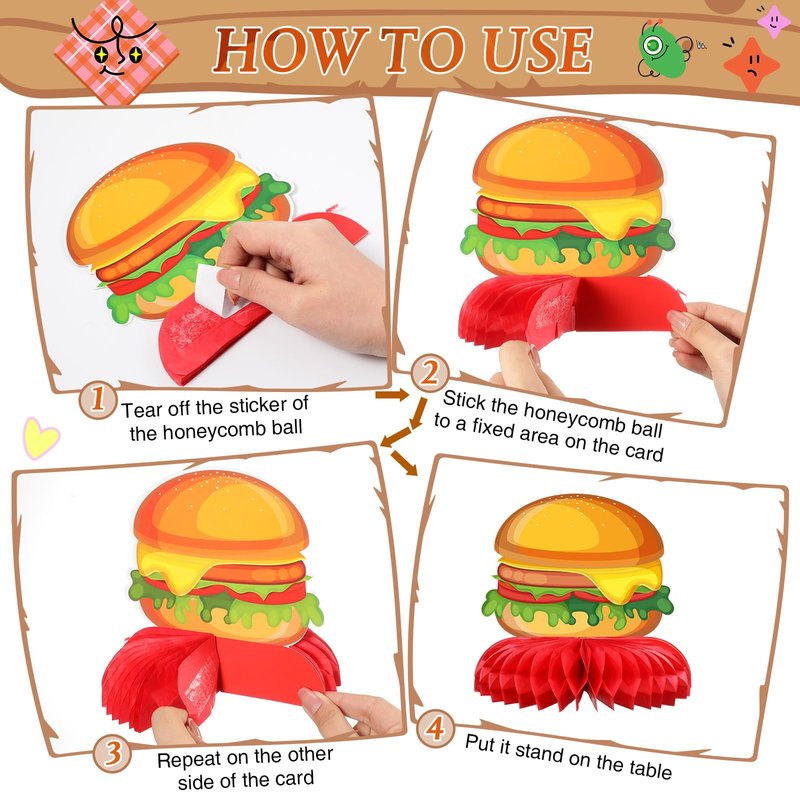 - Easy to Assemble: these BBQ picnic tables centerpieces are convenient for both adults and kids to operate, just peel away the paper film and stick the honeycomb ball to the bottom of the card, then gently unfold the honeycomb ball with your hand to get a complete BBQ honeycomb centerpieces for your summer picnic party
