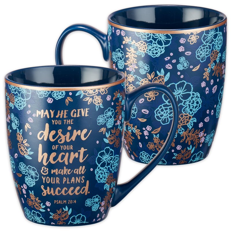 - BIBLE VERSE COFFEE MUG: Christian Art Gift’s features a unique and striking gold foil print floral design with an elegant golden bible verse calligraphy. The front of this navy blue ceramic coffee mug features a line of Scripture from Psalm 20:4. This ceramic cup is 4 inch tall and has a 12 Oz capacity.