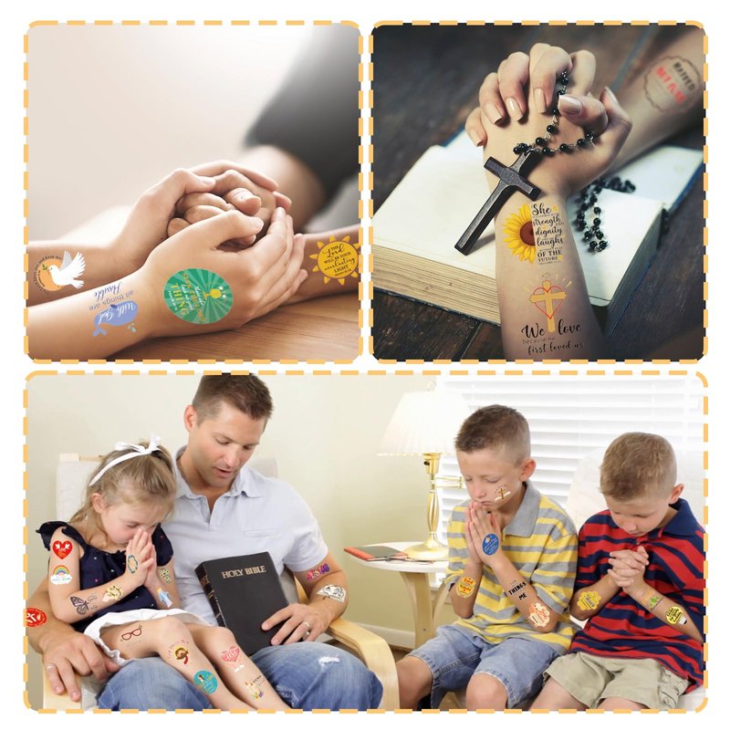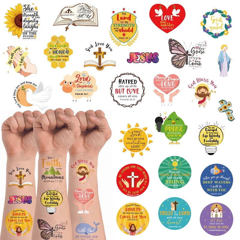 - Christian party decorations Package includes 132 pieces of Religious tattoos in 33 styles of Bible Verse themed temporary tattoos which can be used wherever you want, such as arms, face, and hands