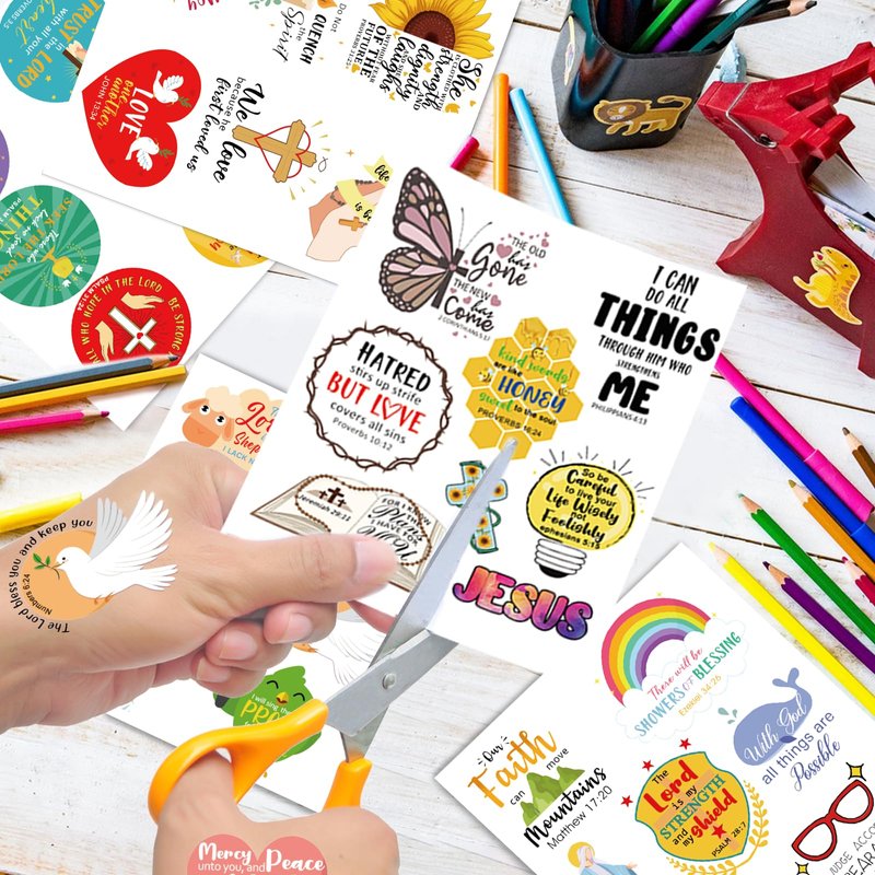 - Bible Verse Scripture Theme Party Decorations Design,20 sheets with 132 pieces of Religious temporary attoos with vividly colorful psychedelic art from Bible,For example alpaca, bible, angel, GOD Love YOU, Fish, cross, dove, and more