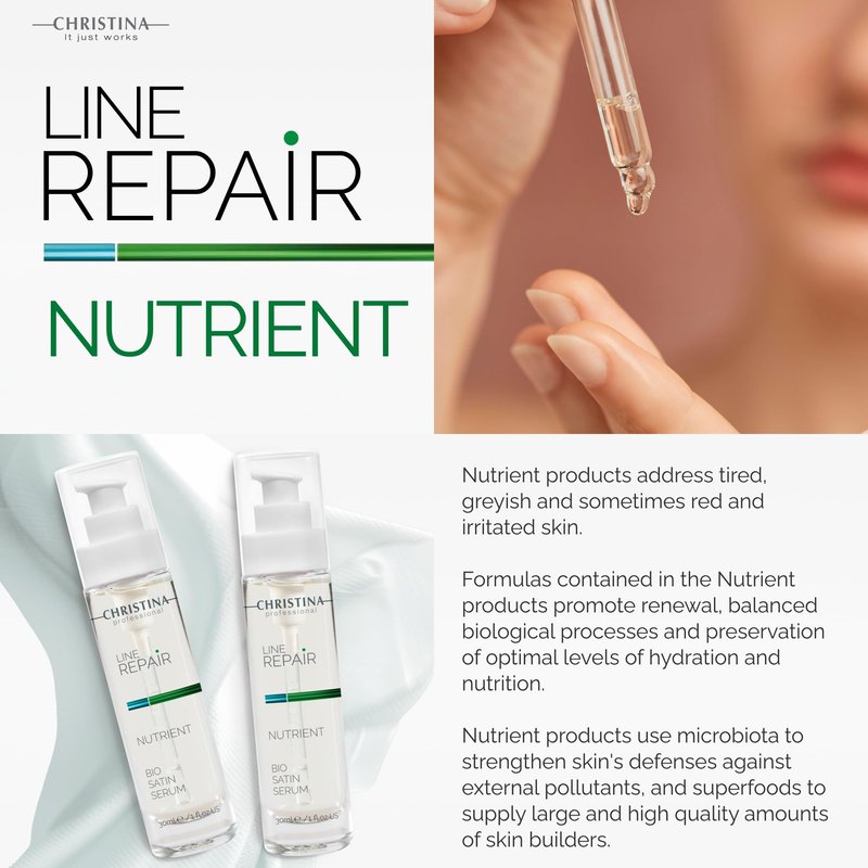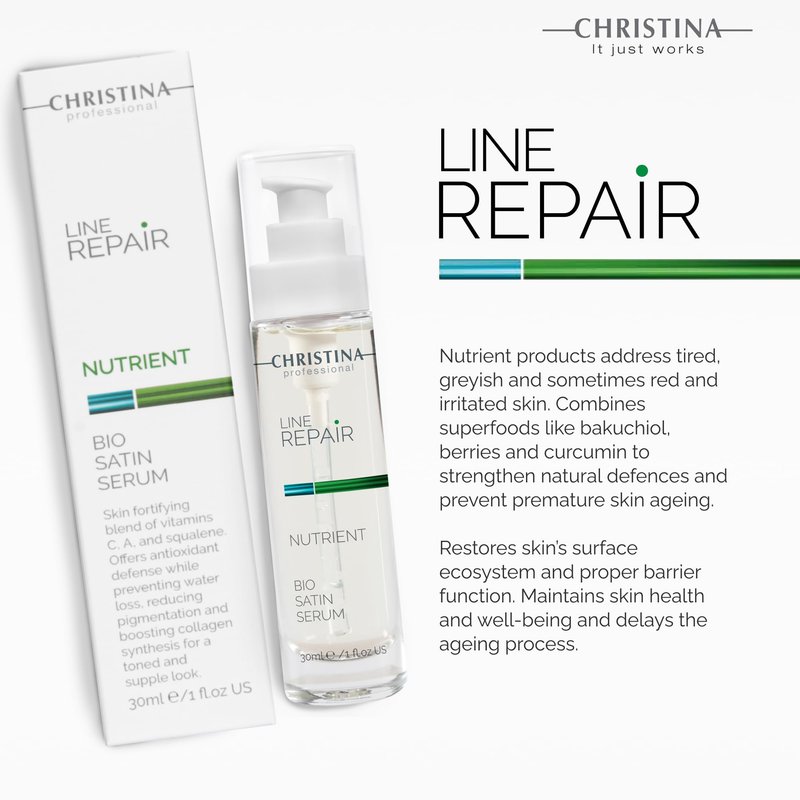 Introducing Christina's Line Repair Nutrient Bio Satin Serum, a luxurious treat for balanced, normal, and dry skin. This serum boasts a pleasant silky texture and is enriched with a potent blend of nutrients and vitamins, delivering a powerful anti-aging effect. Witness the transformation of your skin as this serum promotes smoothness, moisture, and radiance. Vitamin C, a key ingredient, provides robust protection while promoting collagen synthesis for a visibly youthful complexion. Formulated with mild retinol, this serum addresses age-related changes with regenerating and rejuvenating effects. Squalane contributes to the restoration of the skin barrier, alleviating redness and promoting overall skin health. Application is simple—apply the serum to the skin of the face, neck, and décolleté with light massaging movements. Suitable for all age groups, Christina's Line Repair Nutrient Bio Satin Serum is your 24-hour care product, ensuring your skin stays nourished, regenerated, and radiant. Related: retinol serum for face, serum for face anti-aging, facial serums, face serums for anti-aging, serums for skincare, facial serums for aging skin, anti-wrinkle serum, hydrating face serum, night serum, vitamin C serum for face dark spots, skin serum, anti-aging skincare set, dark spots, night serum for face, dark spot serum, serum hidratante para la cara, moisturizing serum, serum retinol, night serum for face anti-aging, skincare products, manchas en la cara, face wrinkle remover, serum para la cara, skincare serum, suero para la cara, serum, sun-damaged skin repair, vitamin c face serum, vitamin c serum, vitamin c serum for face, serum vitamina c, vitamin c face, naturium vitamin c serum, truskin vitamin c serum, vitamina c facial serum, the ordinary vitamin c, truskin, true c, the ordinary vitamin c serum, vit c serum face, vitamina c para el rostro serum, vit c serum, ordinary vitamin c serum, vitamin c for face, best vitamin c serum for face, tru skin vitamin c serum for face, true skin vitamin c serum