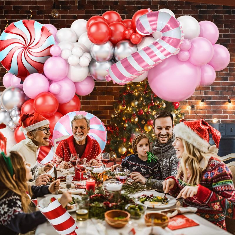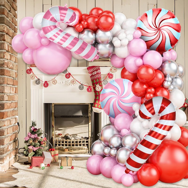 - Christmas Balloon Arch Kit: include 1*18inch pastel pink, 1*18inch red, 25*10inch pastel pink, 15*10inch red, 15*10 inches white, 8*10inch metallic silver, 8*5inch pastel pink, 8*5inch red, 8*5inch white, 6*5inch metallic silver, 2*candy cane balloons, 1*windmill balloon, 1 x balloon chain; 4 x dispensing. Various sizes balloon can make your balloon arch look more layered.