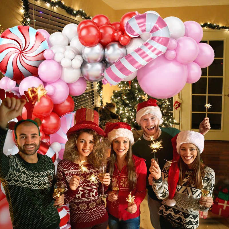 Christmas Balloon Arch Kit, Pink Red White Christmas Balloon Garland Arch Kit with Metallic Silver Balloons Candy Cane Foil balloon for Christmas Party Decorations New Year Xmas Party Supplies
