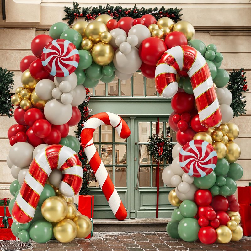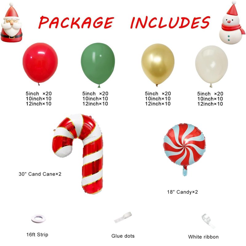 - Christmas Balloon Kit Includes - Red (5"×20, 10"×10, 12"×10), sage green (5"×20, 10"×10, 12"×10), metallic Gold (5"×20, 10"×10, 12"×10), white sand(5"×20, 10"×10, 12"×10), 30" candy cane balloons×2, 18" candy balloons×2, 16ft strip, 100 glue dots, white ribbon