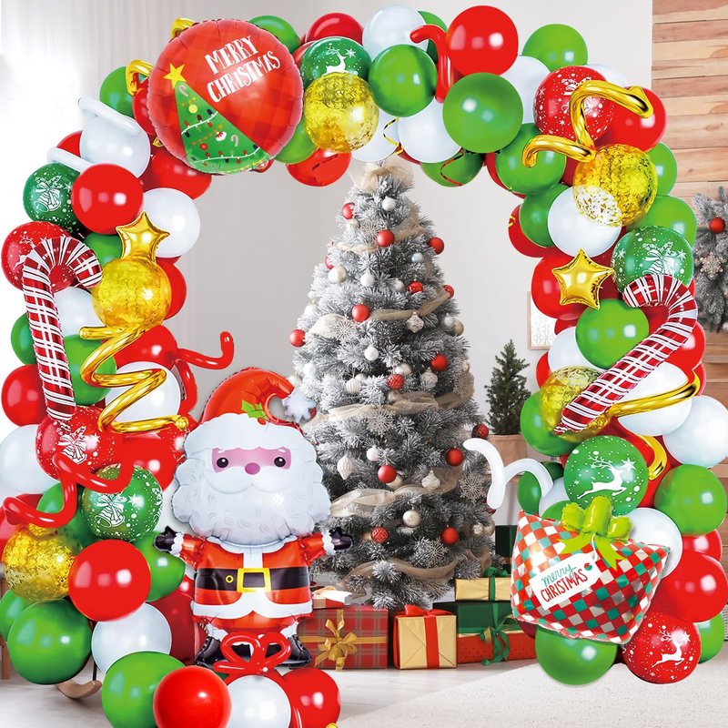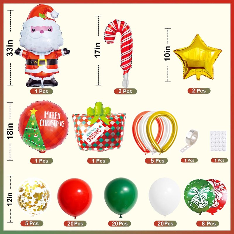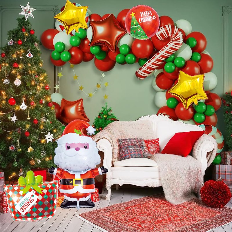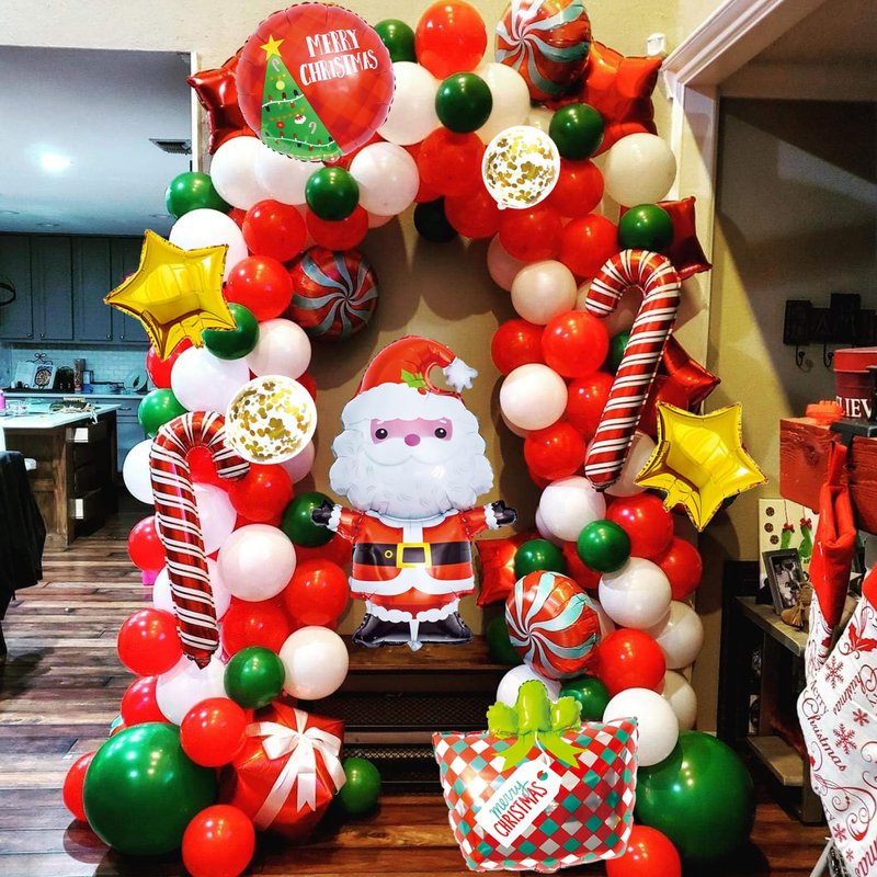 - Christmas Balloon Arch Kit: Package Include 1x Santa Claus Balloons, 2x Candy Balloon, 1x merry Christmas Balloon, 1x Gift Box Balloon, 2x star Balloons, 5x long balloons, 73x 12inch Balloons (5 styles), 100pcs Dot Glue, 1x Balloons Tape Strip, Total are 87pcs, perfect for your Christmas Party Decorations indoor, add a festive touch to your Christmas party.