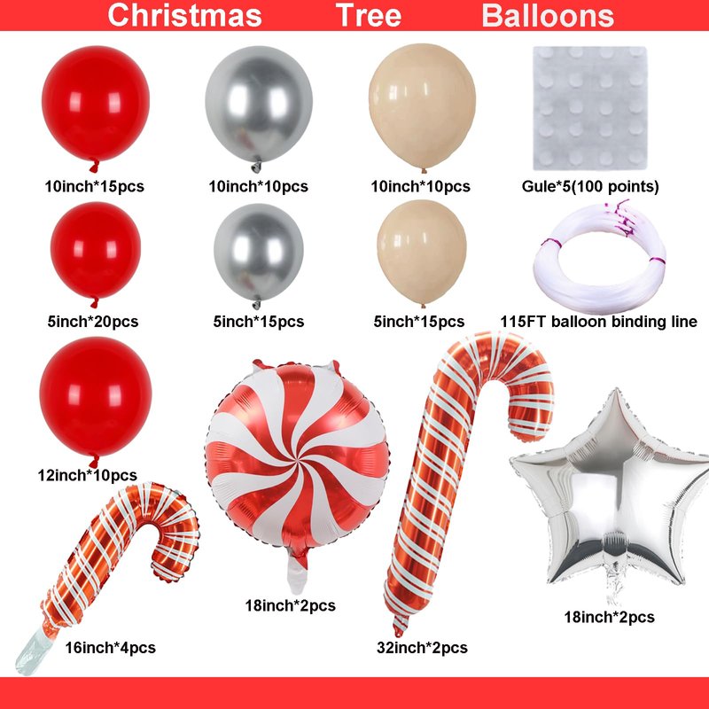 - Christmas Tree Balloons Packaging Includes: Balloon (10pcs 12in red balloons +15pcs 10in red balloons + 20pcs 5in red balloons + 10pcs 10in Silver balloons +15pcs 5in Silver balloons + 10pcs 10in beige balloons +15pcs 5in beige balloons); Aluminum Foil Paper Balloon (2pcs 18in red candy(A little blue at the edges) balloon + 2pcs 18in Silver star balloon+2pcs 33in and 4pcs 15in Candy Cane balloon); Whole Balloon Garland Accessories Kit (115ft long balloon binding line*1 + 100pcs glue*1).