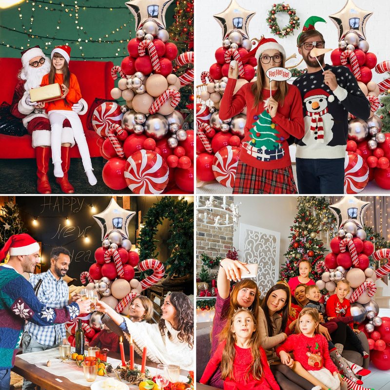 Christmas Balloon Garland Arch Kit, Christmas Tree Balloons Xmas Red Silver Beige Balloons and Candy Foil Balloons Silver Star Balloons for Christmas Party Decorations Birthday Party New Year Party