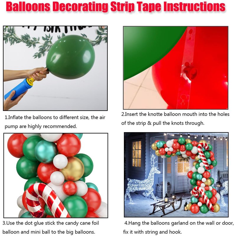 - ❄️【Easy To Use】: For your convenience, we already offer balloon strip and dot glue to help you make balloon garlands or arches. First, blow up the balloons in different sizes. Second, put the tail of the balloon into a knot and put it in the big hole. Then pull the balloon knot from the large hole into the small hole. Last put all the balloons into the balloon chain in the order you like. Creating great Christmas party atmosphere, it will be your best choice.