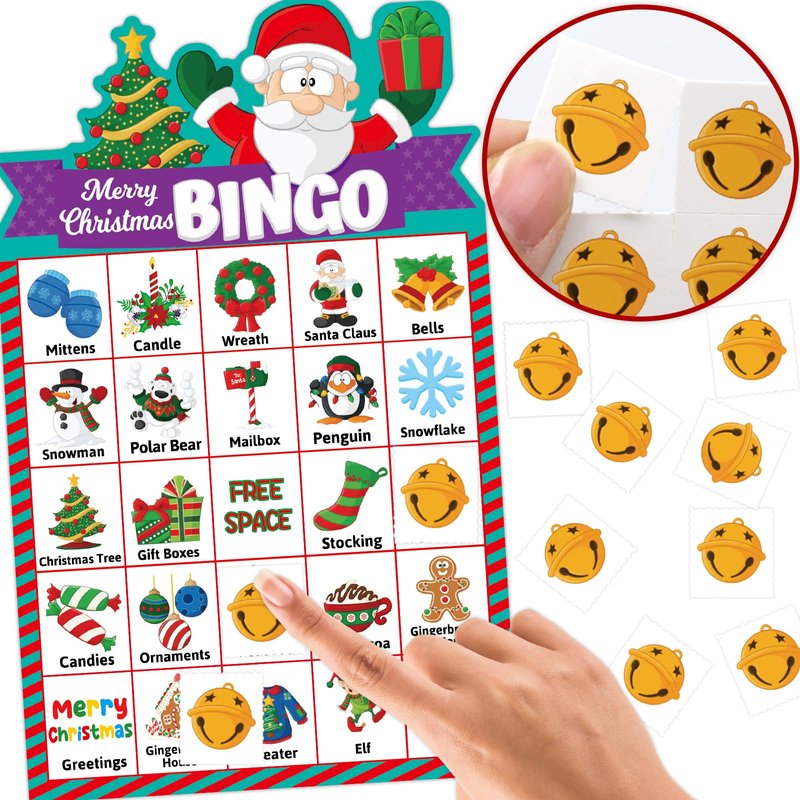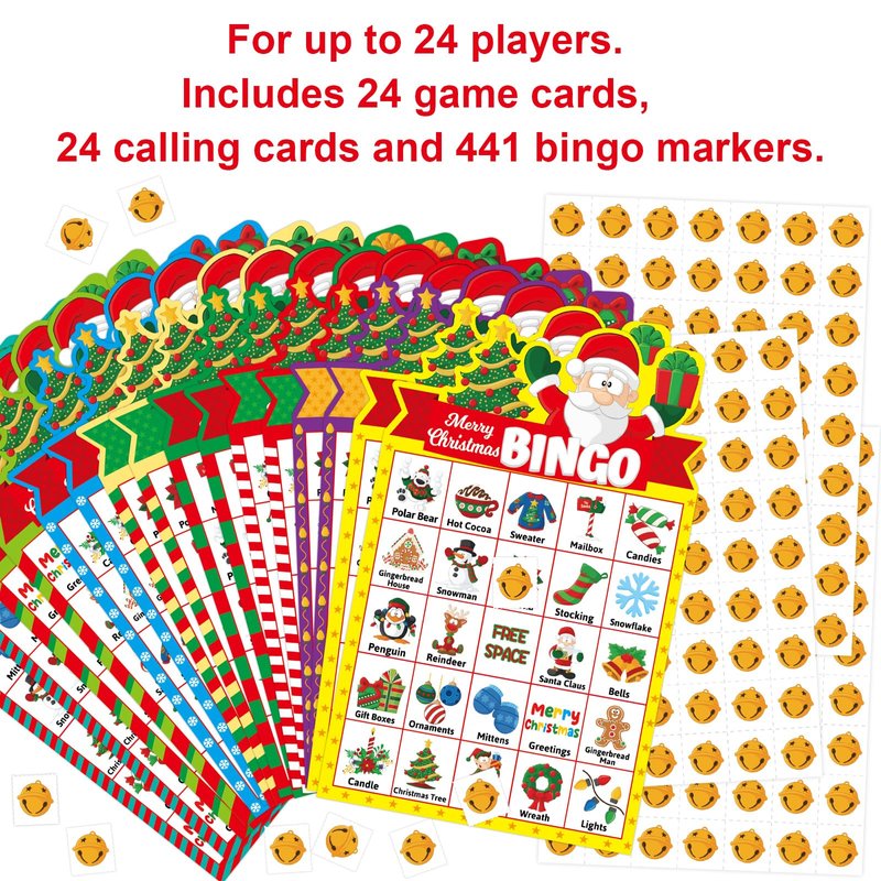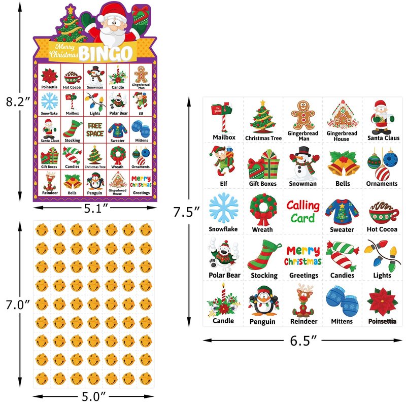 Package Includes: 24 Christmas theme bingo cards, 441 bell bingo card chips, 24 call out cards; 8.2 x 5.1 inches player cards; Easily cut along dotted lines of chips sheets and calling card sheet; Santa Claus shape player cards Christmas Bingo Game for Kids: An easy game for kids to play; The holiday bingo game cards are full of favorite Christmas characters, such as Gingerbread men, Christmas trees, wreaths and so on; They'll add a lot of fun to your Christmas parties Great Christmas Gifts: Our Christmas party game sets are available for both kids and adults; Great holiday gifts for families and friends; Perfect choice for Christmas party gathering Popular Board Game: Great interactive board game for school activities, classroom holiday parties, family winter parties and office Christmas games and more; Great Christmas gifts for kids and adults Our Advantages: Colorful printed; Thick paper cardstock; Reusable; Perforated design, easy to cut along dotted lines of chip sheets and caller card sheet; Well packaged in a box
