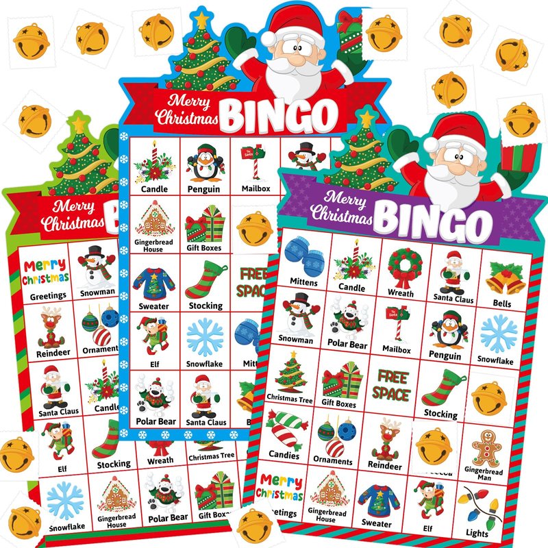 - Package Includes: 24 Christmas theme bingo cards, 441 bell bingo card chips, 24 call out cards; 8.2 x 5.1 inches player cards; Easily cut along dotted lines of chips sheets and calling card sheet; Santa Claus shape player cards
