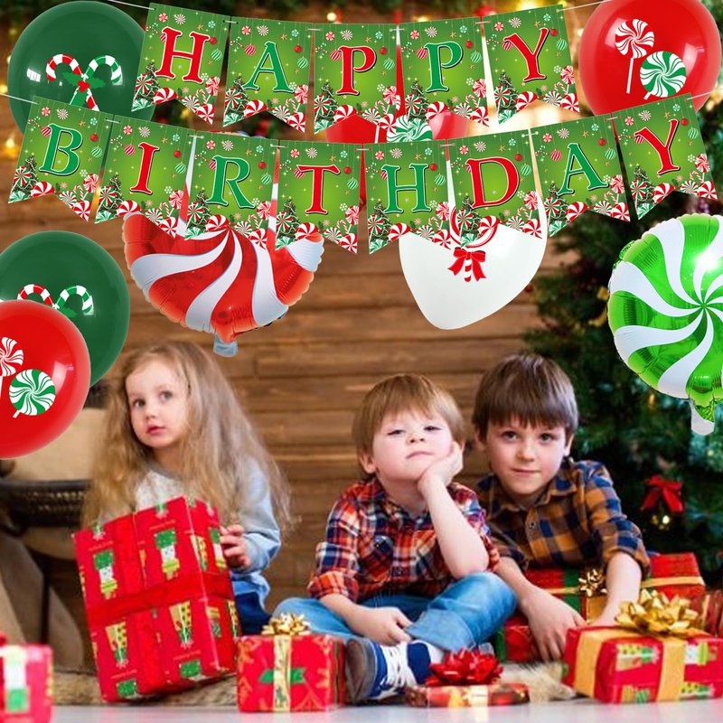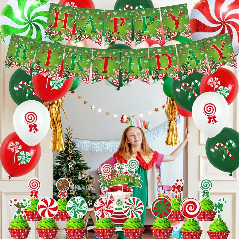 - Christmas Candy Birthday Party Kit- 1* happy Birthday Banner;2* candy foil Balloons,1* happy Birthday Cake Topper,12* candy cupcake topper,18Pcs candy balloons,prefect combination to meet your Christmas birthday decorations need.