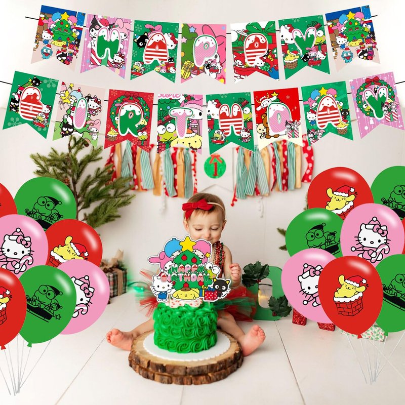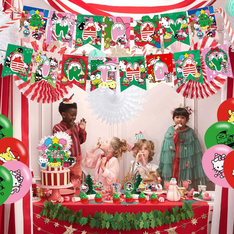 Christmas Birthday Party Supplies, Kawaii Theme Party Decorations Include Birthday Banner Cake Toppers Balloons for Girls and Boys Baby Show