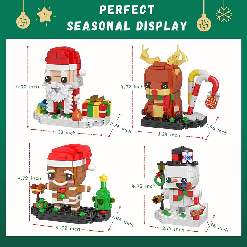 4 in 1 Christmas bricks set includes 4 christmas characters. Mr Claus festive red and white outfits; Gingerbread man with realistic X'mas tree and food;Red nose Reindeer and Snowman with hat. That makes a festive holiday centerpiece kids of all ages will love
