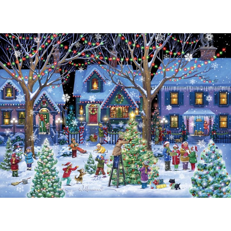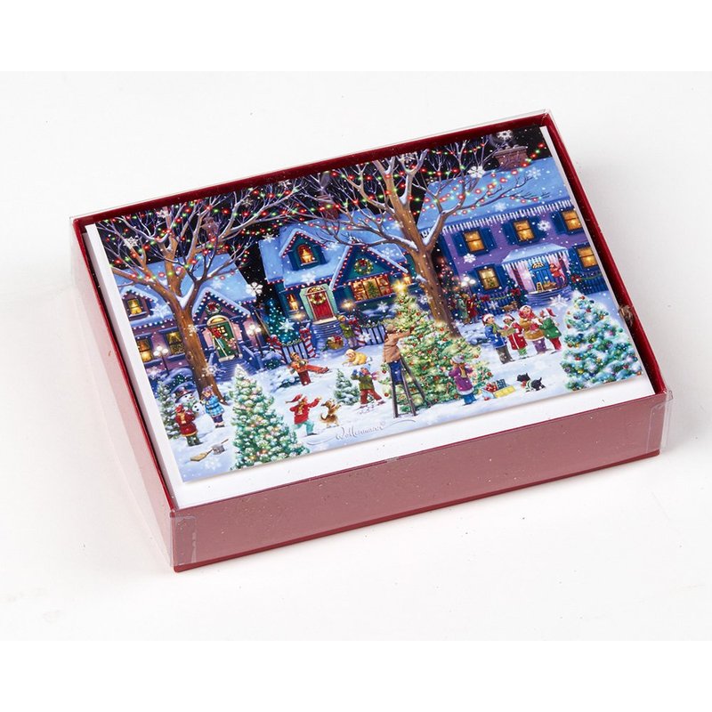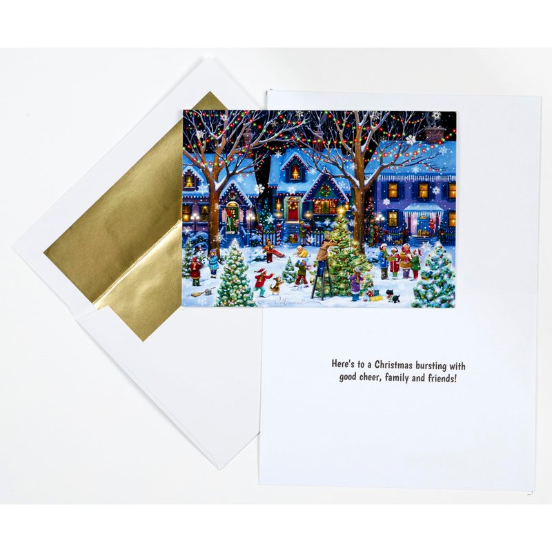 Box of 15 Christmas cards and 16 deluxe gold foil lined envelopes. Cards measure 4 1/2"x6 1/4" when folded. All of our Christmas cards are proudly printed in the U.S.A. on durable card stock and neatly packaged in an attractive red box. The artist for this card is Randy Wollenmann. Inside greeting: Here's to a Christmas bursting with good cheer, family and friends!