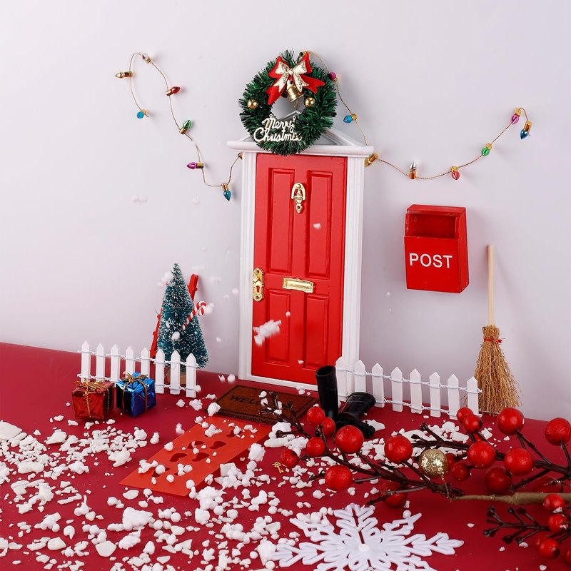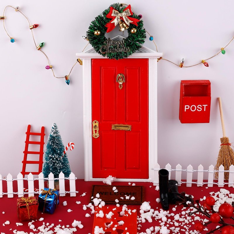 - Package Content: You will receive a Christmas fairy door kit, including 1 x wooden door, 1 x key, 1 x mailbox, 1 x decorative garland, 1 x carpet, 1 x broom, 1 x footprint paper, 1 x wooden ladder, 1 x Christmas tree, 1 x decorative string lights, 2 x fence, 2 x boots, 2 x candy canes, 2 x gift boxes, 2 x self-adhesive glue, enough quantity to meet your Christmas decoration needs.