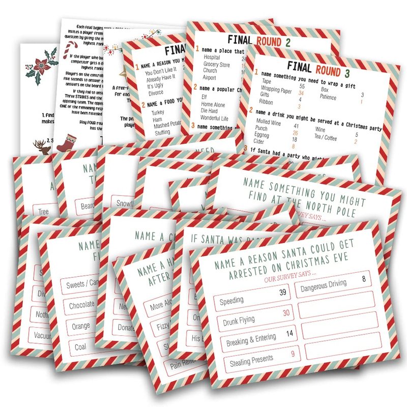 - This is a Christmas theme of the classic friendly feud game! Includes 3 game instruction cards + 12 question moderator cards and 3 quick final rounds game cards.