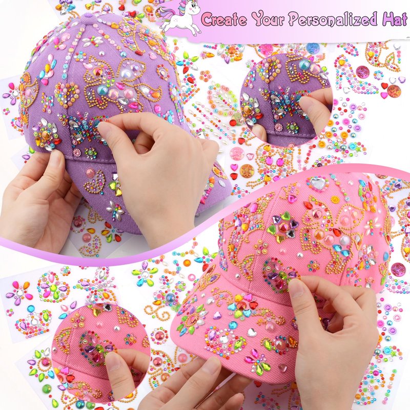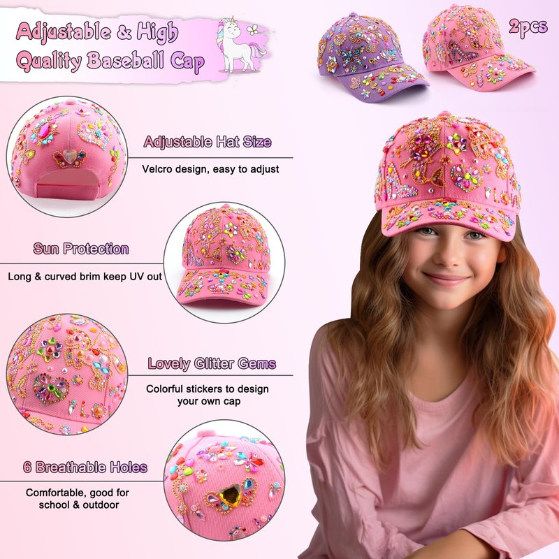 - 💜DIY Arts and Crafts for Kids - Let's decorate your own baseball cap! This craft kit comes with 2pcs baseball caps(purple and pink), 12 sheets of adhesive gems stickers designed in different patterns and a beautiful box. A complete craft kit to meet your little girls DIY needs.