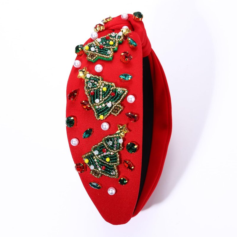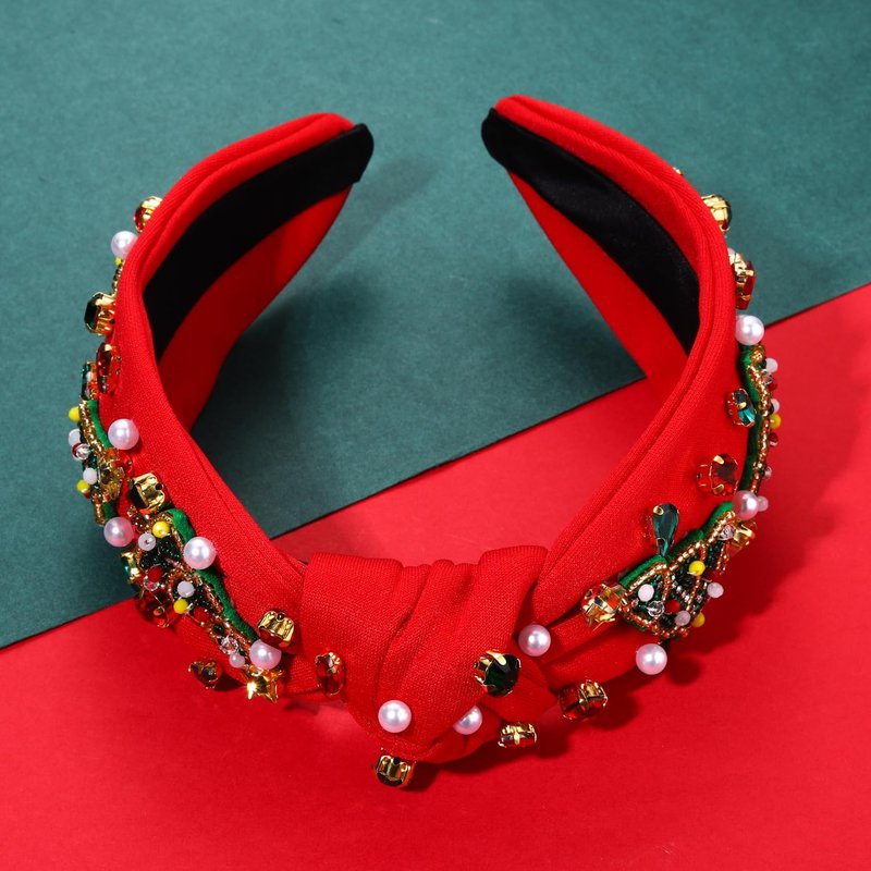 Christmas Headband for Women Holiday Christmas Accessories Beaded Xmas Bow Tree Snowflake HOHOHO Knotted Headband Red Green Crystal Pearl Top Knot Headband Festive Holiday Gifts (Xmas Tree 10)