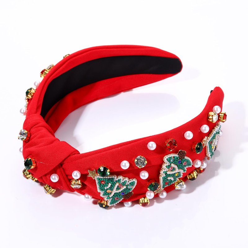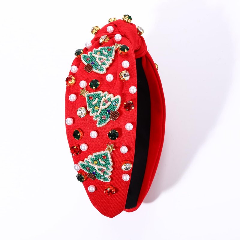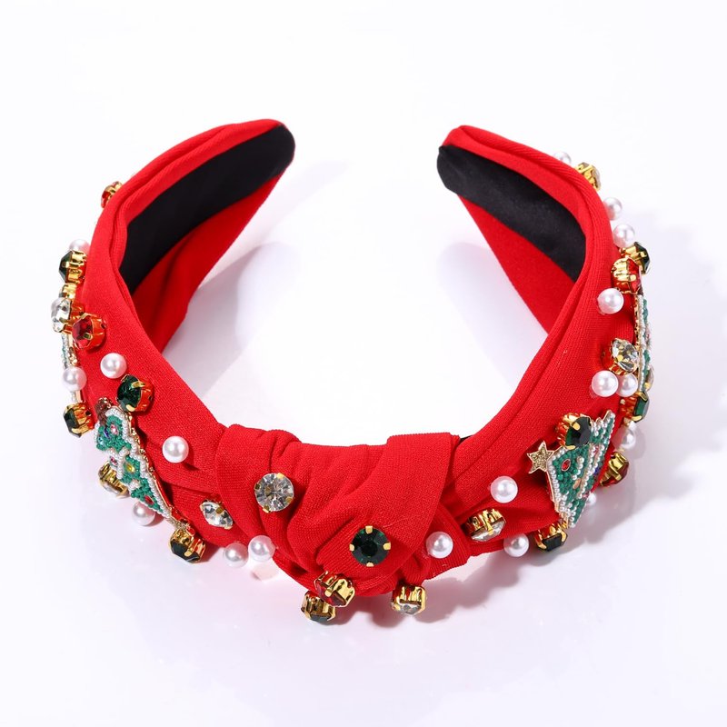Christmas Headband for Women Holiday Christmas Accessories Beaded Xmas Bow Tree Snowflake HOHOHO Knotted Headband Red Green Crystal Pearl Top Knot Headband Festive Holiday Gifts (Xmas Tree 3)