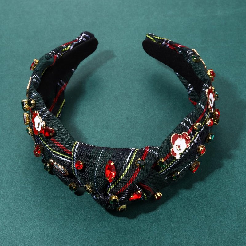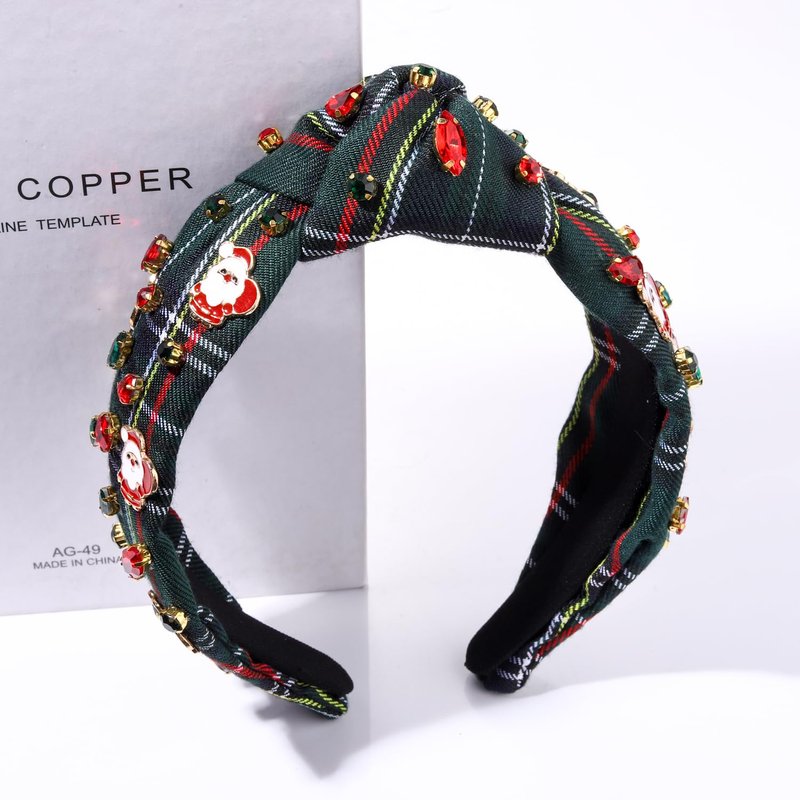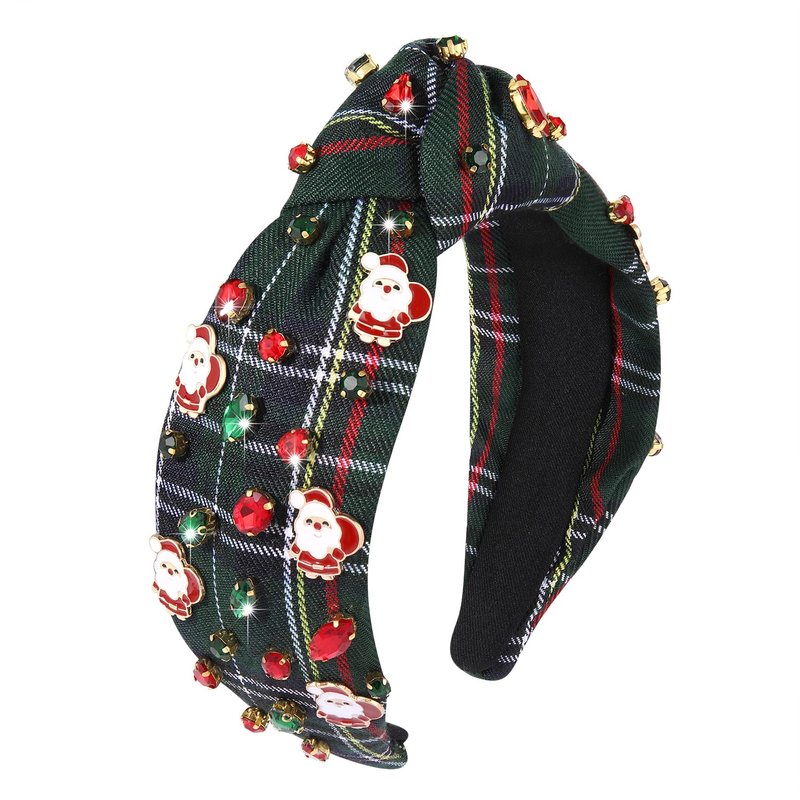 - Christmas Headband for Women: Do you want to buy a hair accessory for your Xmas celebration activity? Here is a fun & unique Christmas jeweled hair hoop accessories for you. features green plaid knot headband decorate with Santa Claus charms and sparkle Christmas themed red green rhinestone crystal beads, perfect for Christmas party use. You will be special and eyes-catching. Make the party ambience be cheerful. So don't hesitate and come to buy one! You will not regret it if you buy it!