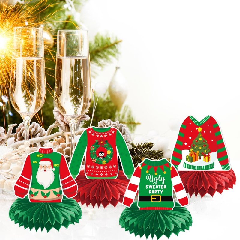 - Winter Festive Decor: These Christmas honeycomb centerpieces feature fun and festive designs, including Christmas sweaters and holiday patterns, adding a touch of whimsy to your party decor.