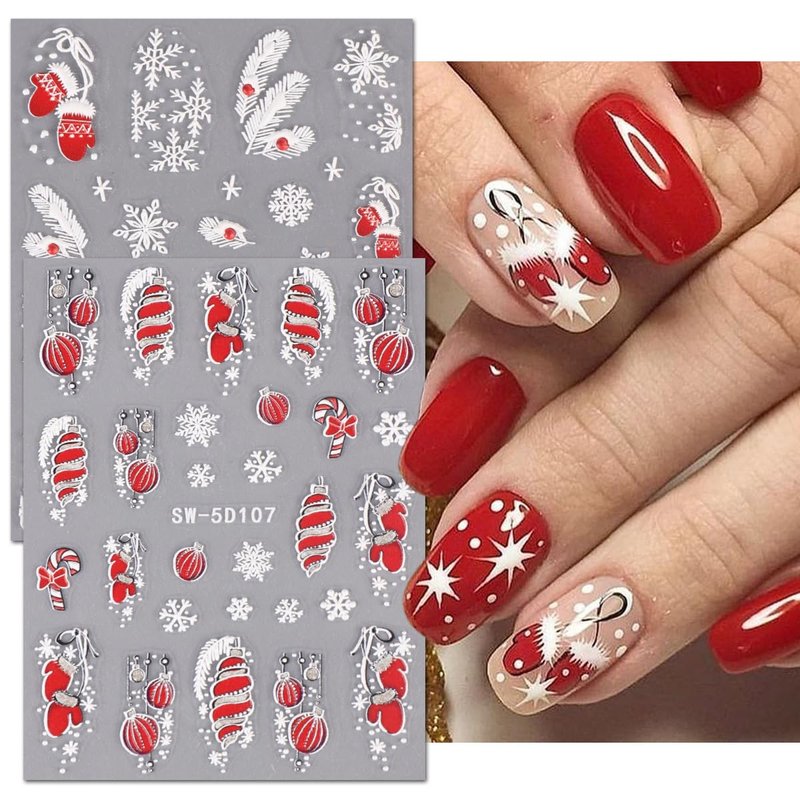 - 🎅❄️【Christmas Nail Stickers】3 sheets 5D stereoscopic Christmas nail stickers,with many Christmas elements for you to choose from.It also contains classic winter elements such as red gloved, feather snowflake design.