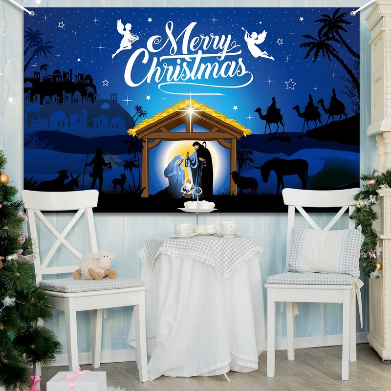 - Christmas Nativity Scene Decorations: Merry Christmas nativity backdrop decoration design with Merry Christmas sign, angel, sheep, manger, camel, nativity scene and stars, Jesus bring you good luck, suitable for Christmas family gatherings and some religious events.