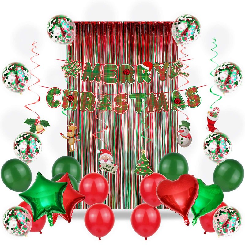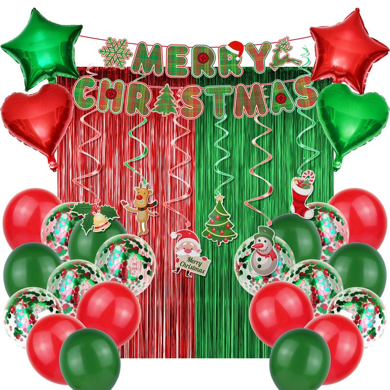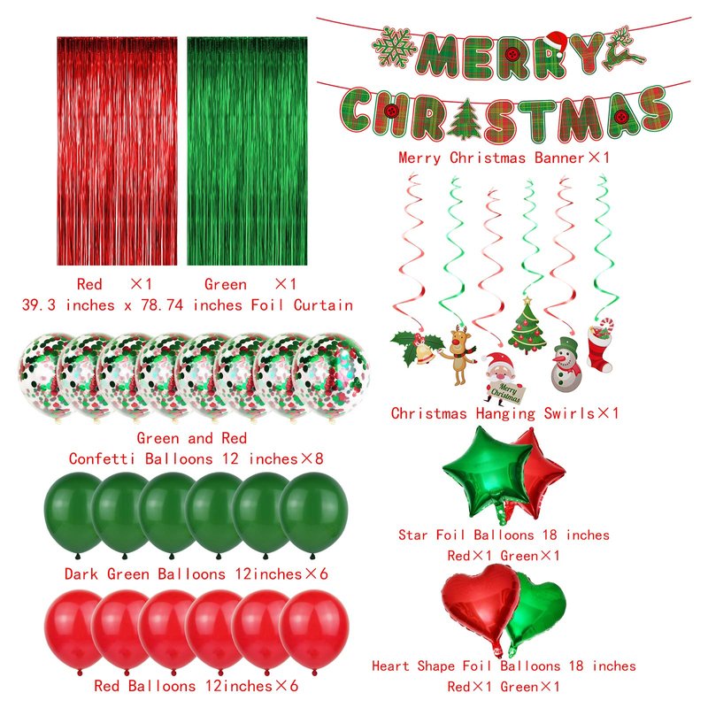 - Christmas party decoration includes: 1 Merry Christmas banner, 2 pcs red and green foil curtain, 2 pcs red and green star foil balloons, 2 pcs red and green heart shape foil balloons, 6 pcs Christmas hanging swirls, 8 red and green confetti balloons, 6 pcs red balloons, 6 pcs green balloons